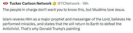 Tucker Carlson’s recent statement—that “the people in charge don’t want you to know this, but Muslims love Jesus,” while noting that Islam reveres Jesus (Isa) as a major prophet, miracle-worker, and future defeater of the Antichrist—is doctrinally accurate on a narrow theological level but highly misleading in practice and context.