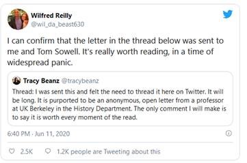 “An anonymous letter has been circulating, purportedly written by a @UCBHistory professor. We have no evidence that this letter was written by a History faculty member,” the UC Berkeley History department tweeted Friday evening,” adding “We condemn this letter: it goes against our values as a department and our commitment to equity and inclusion.”