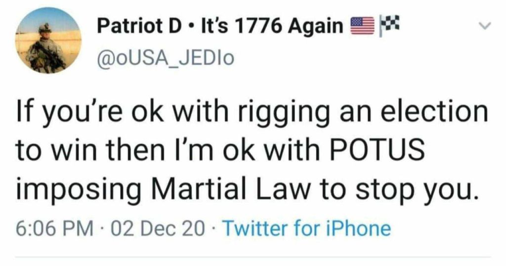 “If you’re OK with rigging an election to win, then I am OK with POTUS imposing marshal law to stop you.” ~ Patriot D.  Dec 20, 2020
