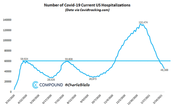 Even if you believe the high false positive PCR tests, COVID-19 hospitalizations in the U.S. are at lowest level since November, 2020 and have been declining for 50 straight days. That decline begins immediately after inauguration day in the U.S. and perhaps you even believe that is coincidence.