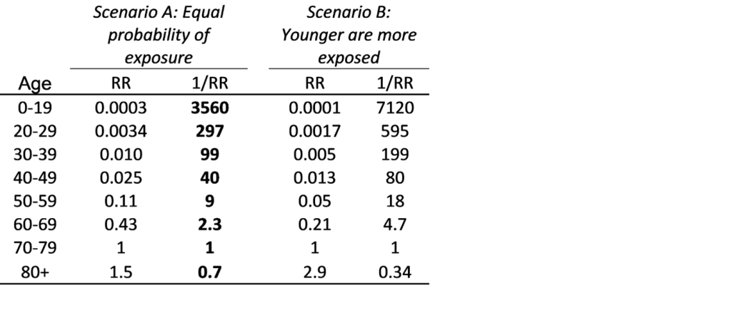 With age 70-79 as baseline, relative mortality risks are shown in Table 1. For COVID-19 exposed individuals, people in their 70s have roughly twice the mortality of those in their 60s, 10 times the mortality of those in their 50s, 40 times that of those in their 40s, 100 times that of those in their 30s, 300 times that of those in their 20s, and a mortality that is more than 3000 times higher than for children. Under Scenario B, with higher exposure among the young, the age differences are even larger.