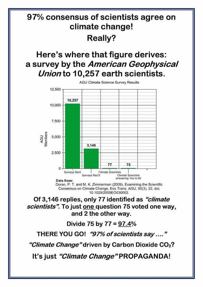 And statements like “97% consensus of scientists agree on climate change!” made by the presidents and prime ministers of nations, multinational organizations and charlatan so-called “environmentalists.”