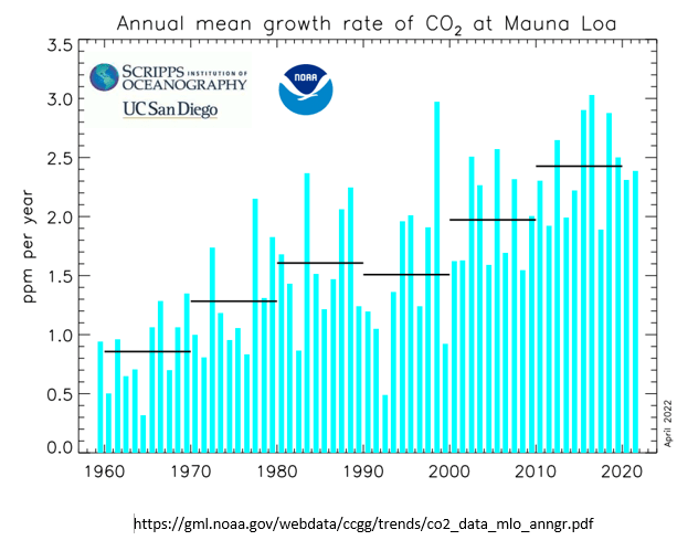 Humans cannot change net global average atmospheric CO2 concentration.  We can not increase CO2 concentration and we cannot decrease CO2 concentration at the global level.  Therefore, the contribution of CO2 by humans has no effect on global temperature or climate change.  CO2 from burning fossil fuels does not increase net global average atmospheric CO2 concentration nor change the rate of growth of CO2 concentration, nor increase earth’s temperature.  CO2 concentration in air and CO2 concentration in water are determined primarily by Henry’s Law, the Law of Mass Action and Le Chatelier’s principle.