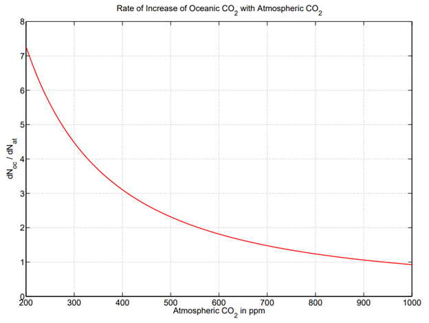 “Figure 7: The equilibrium rate, dNoc/dNat, of increase of CO2 in the oceans with the increase of CO2 in the atmosphere. The ocean alkalinity is [A] = 2.3 × 10-3 M and the temperature is T = 25 C… The rate of increase, dNoc/dNat, of CO2 in the ocean with CO2 in the atmosphere is shown in Fig. 7. Because of the long time (centuries) needed for additional CO2 molecules dissolved in the ocean surface to reach the deeper ocean, the currently observed rate, dNoc/dNat ≈ 1, is about three times smaller than the predicted equilibrium rate.” (Cohen & Happer, 2015)