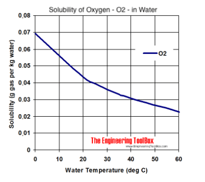 We see by comparing the graph above with the graph immediately below, both at 25 degrees C, CO2 gas is about 37.5 times more soluble in water than O2 and that both gases are more soluble in cold water than warm water.  Generally, we know oxygen is plentiful in ocean because fish and other sea life live there and absorb oxygen gas through their gills for their respiration.   Henry’s Law also applies to the solubility of oxygen and other gases in water and in seawater, and oxygen and carbon dioxide in blood, etc.