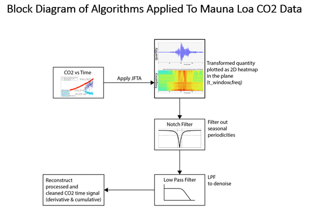 After the notch- and low-pass filtering of the JTFA-produced data — represented by the relevant boxes in the Block Diagram — the filtered JTFA transform is then inverted. This computation yields the output (lower-left) box of the Block Diagram — the processed CO2 vs. time signal (and its time derivative).
