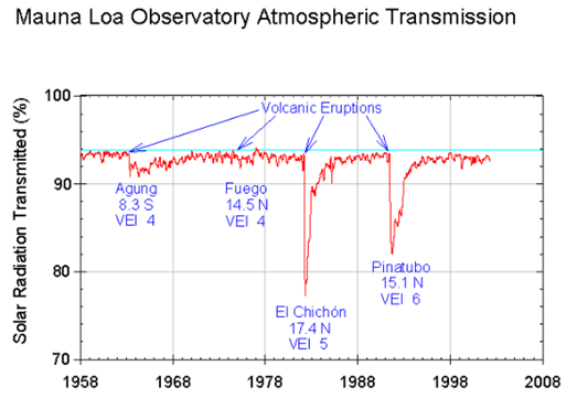 Figure 2 from the Mauna Loa Observatory shows reduced atmospheric transmission of solar radiation due to volcanic aerosols after the Pinatubo volcanic eruption.