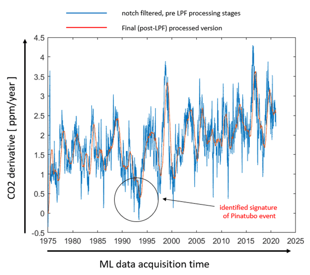 If this first phase data experiment worked, then the overall scientific complexity, effort, and expense of our project would be greatly reduced. The most difficult data experiment was done first: could we detect the Pinatubo perturbation in the MLO data?