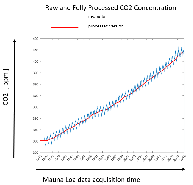 The graph in Figure 7 above is plotted over the entire Mauna Loa recording epoch (circa 5 decades) with both the “raw” (as defined above) and processed (as defined above) CO2 levels, vs. time. The graph appears very similar to the graphs typically produced by NOAA which appear frequently in media, education, politics and online.
