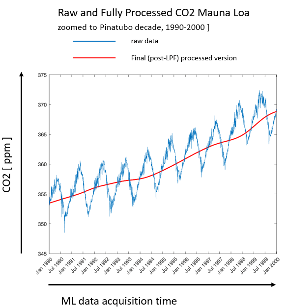 The graph above in Figure 8 is processed as in the previous graph in Figure 7 and described in the method section above but simply zoomed in to cover only the Pinatubo decade: 1990-2000. The slope of the red line is visibly bending or flattening in July of 1991 into 1994, and then in 1995 the slope turns upward again.