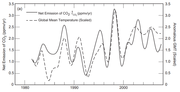 As seen in the NOAA graph at the end of the introduction above, the time derivative of CO2 concentration follows quickly in months the time derivative of sea surface temperature (SST).