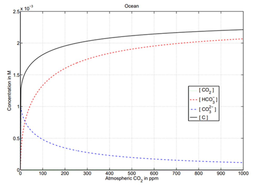 Most of the CO2 in seawater is in DIC form, which, according to most estimates, is on the order of 38,000 gigatonnes (Gt) of DIC dissolved or reacted in deep seawater. Meanwhile 1000 Gt of DIC is estimated to be in surface seawater and 850 Gt in air. (One Gt is 1000 billion kilograms, that is, 1 followed by 12 zeros, or 1 X 1012 kilograms). Figure 4 below (Cohen & Happer, 2021) illustrates the relative molar stoichiometric concentrations of the DIC species in ocean corresponding to atmospheric CO2 concentration. Barely visible, the fine dotted green line slightly above the horizontal axis is increasing. The concentration of the CO2(aq) species of DIC in ocean and the concentration of the bicarbonate species in ocean are both increasing as atmospheric CO2 concentration increases. Simultaneously, the carbonate ion [CO2− 3] of carbonic acid is decreasing, along with alleged problems of so-called “ocean acidification”.