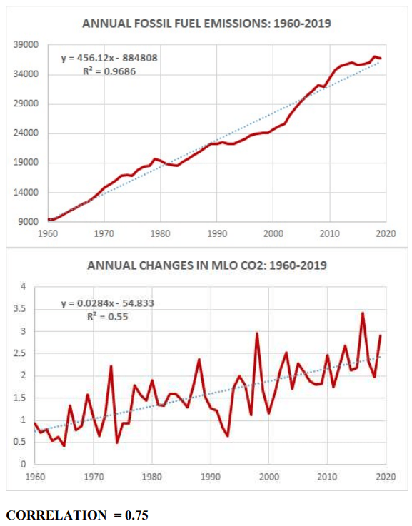 For example, Friedlingstein et al, assume that only about 50% of human emissions are absorbed by the environment.  Why? How?  This assumption is apparently based on their complex estimates of human CO2 emissions and slope of human CO2 emissions in a well-hidden correlation with the net global average atmospheric CO2 concentration reported by NOAA/Scripps Mauna Loa.  First, this is an apples and oranges comparison.  Second, facts, experimental data and statistical analysis do not support that correlation.  And, even if that correlation were supported by evidence, as we all know and frequently ignore, correlations do not prove a cause-and-effect relationship exists. It is essentially a “plug” to make the numbers come out as they wish.  Friedlingstein et al and their followers assert the so-call “airborne fraction” argument.