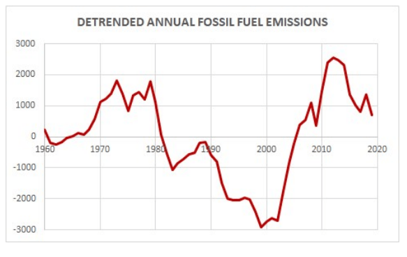 Some of those people look at the two graphs above and notice that the two trends are diverging, and calculated fossil fuel CO2 emissions are growing faster than necessary to explain the trend in net CO2 concentration. The gap between the two trends they call the “Airborne Fraction”. If you struggle through reading Friedlingstein et al, you will see that the Airborne Fraction is obfuscation and fudge factors, and uncertainties are not resolved.