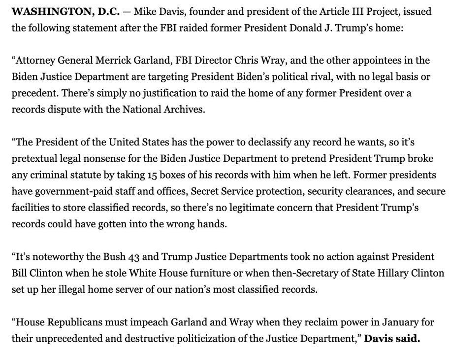 “Even if President Trump had classified records in his possession, they were protected. All former Presidents get a federally funded office, security clearances, Secret Service protection, and secure facilities (SCIFs) for classified records.” – @mrddmia